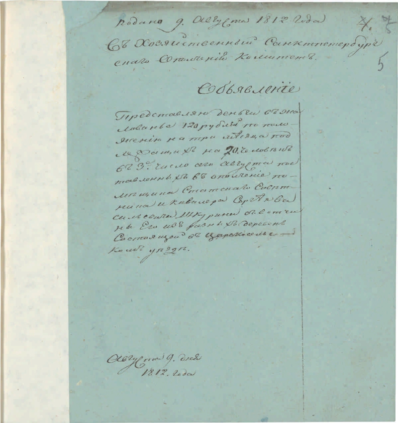 Объявление от 9 августа 1812 г. в Хозяйственное отделение Комитета С.-Петербургского ополчения о предоставлении помещиком С.-Петербургской губ. ст. сов. С. В. Шкуриным жалованья ополченцам-крестьянам, снаряженным им [Документ] . - 1812. - 1 л. - (Фонд Шкуриных : коллекця) . - Написано от руки