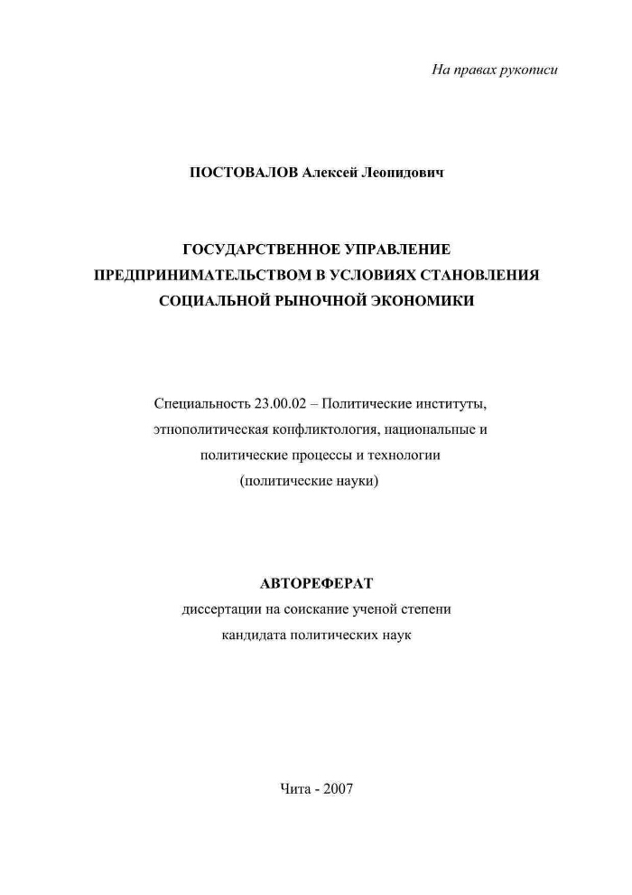 Государственное управление предпринимательством в условиях становления социальной рыночной экономики : автореф. дис. на соиск. учен. степ. канд. полит. наук : специальность 23.00.02 / Постовалов Алексей Леонидович ; [Чит. гос. ун-т]. - Чита, 2007. -22 с. ; 21 см.. - Библиогр.: с. 21-22 (8 назв.) и в подстроч. примеч. . -100 экз.