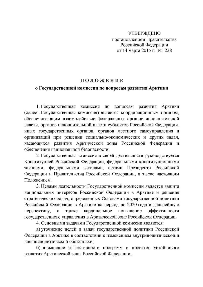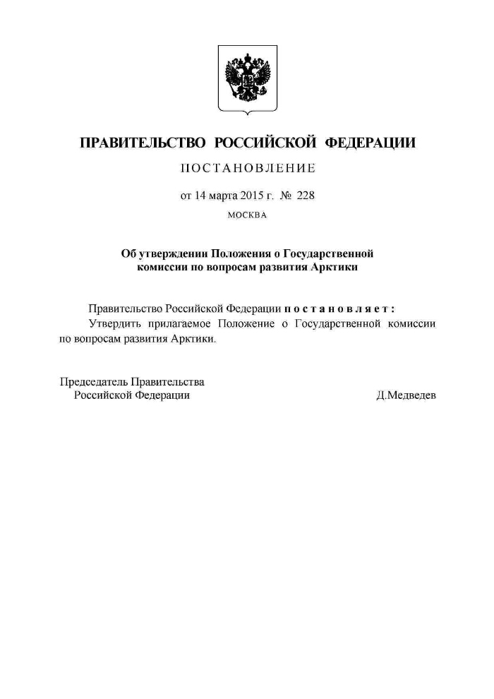 Об утверждении Положения о Государственной комиссии по вопросам развития Арктики : Постановление Правительства Российской Федерации от 14 марта 2015 года № 228. - Москва, 2015. - 1, 6 листов. - В конце текста подпись: Председатель Правительства Российской Федерации Д. Медведев. Место подписания: Москва. Электронная версия правового акта (7 файлов, 300 dpi, JPEG, 5,5 МБ). Содержит: Положение о Государственной комиссии по вопросам развития Арктики : утверждено постановлением Правительства Российской Федерации от 14 марта 2015 года № 228. - Опубликовано в изданиях: Собрание законодательства Российской Федерации от 2015 г., № 13, ст. 1928 ; Официальный интернет-портал правовой информации (www.pravo.gov.ru) от 23.3.2015 г. (№ 0001201503230017).