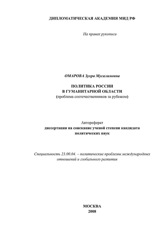 Политика России в гуманитарной области : (проблема соотечественников за рубежом) : автореф. дис. на соиск. учен. степ. канд. полит. наук : специальность 23.00.04 / Омарова Зухра Мусалимовна ; [Дипломат. акад. МИД РФ]. - Москва, 2008. - 20 с. - Библиогр.: c. 18-19 (3 назв.) и в подстроч. примеч.