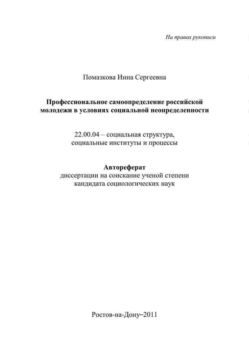 Профессиональное самоопределение российской молодежи в условиях социальной неопределенности : автореферат диссертации на соискание ученой степени кандидата социологических наук : специальность 22.00.04 / Помазкова Инна Сергеевна ; [Юж. федер. ун-т]. - Ростов-на-Дону, 2011. - 33 с. : ил. ; 21. - Библиогр.: с. 32-33 (8 назв.). - 100 экз.