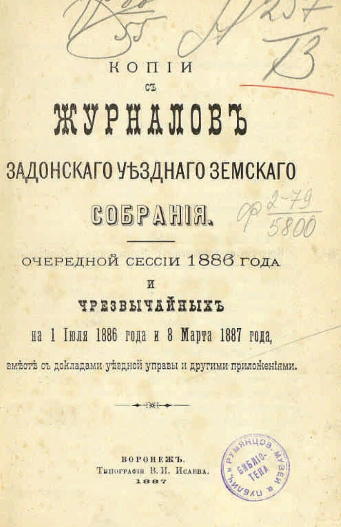 Журналы Задонского уездного земского собрания ... - Воронеж : В тип. губ. правления, 1867-1916. - 25 см. - Место изд. части журн.: Липецк, Елец. Загл. журн.: за 1874 г. - Постановления Задонского уездного земского собрания; 1879-1886 гг. - Копии с журналов Задонского уездного земского собрания.