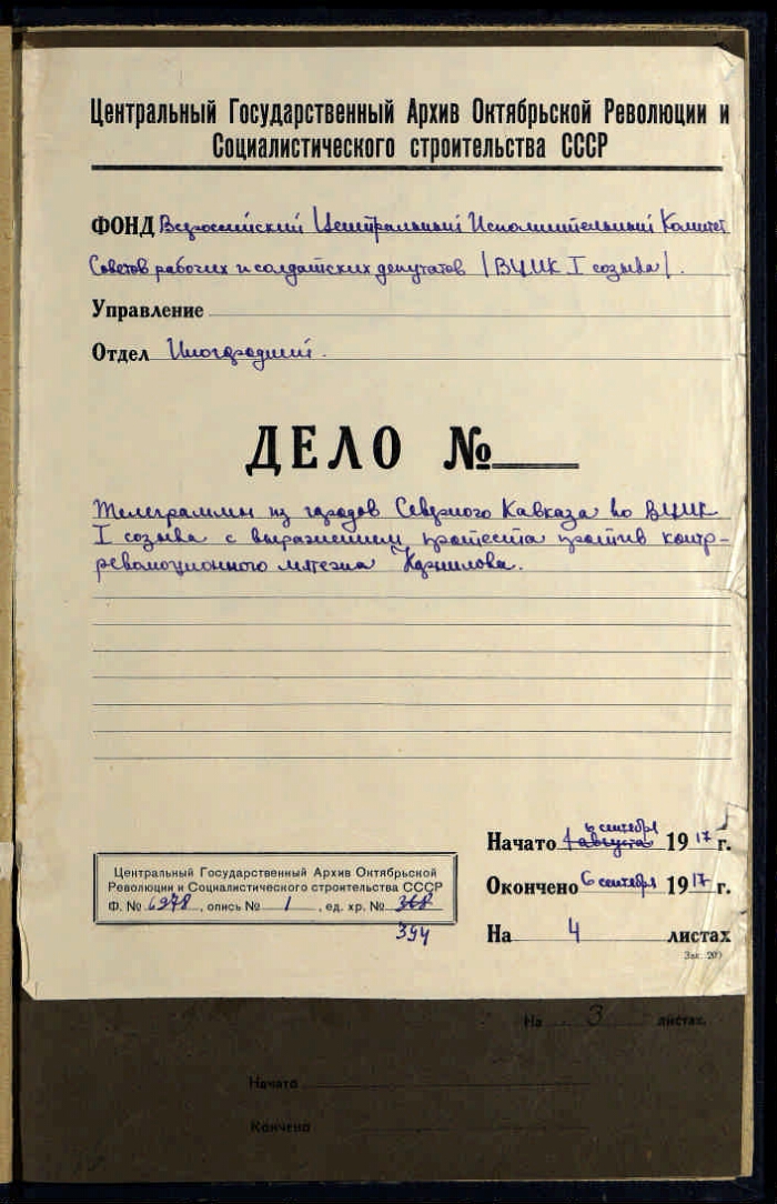 Телеграммы из городов Северного Кавказа во ВЦИК I созыва с выражением протеста против контрреволюционного мятежа Корнилова