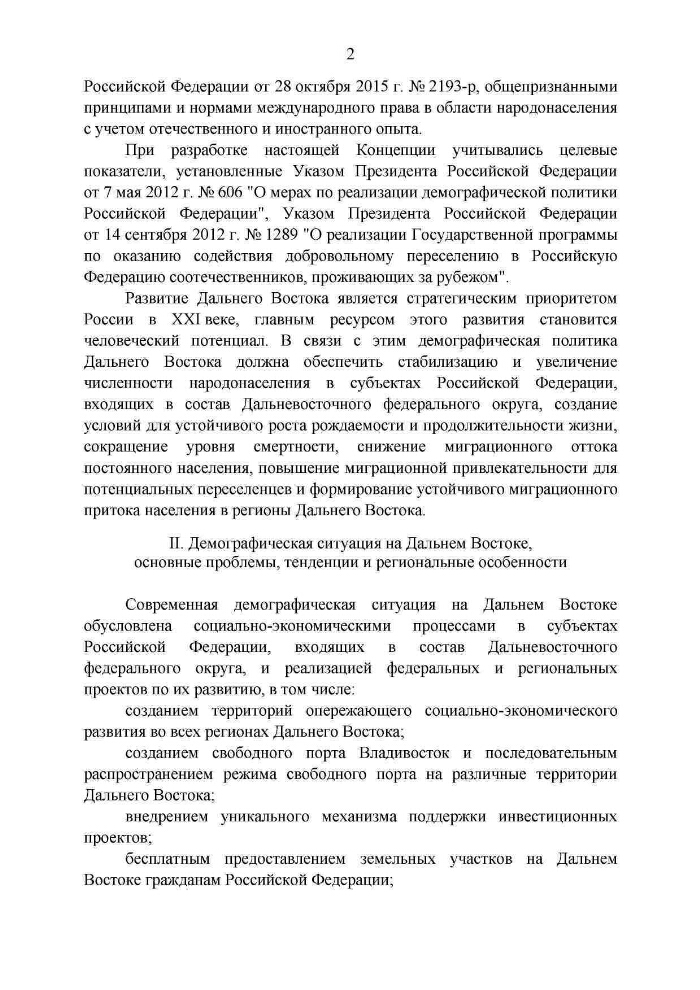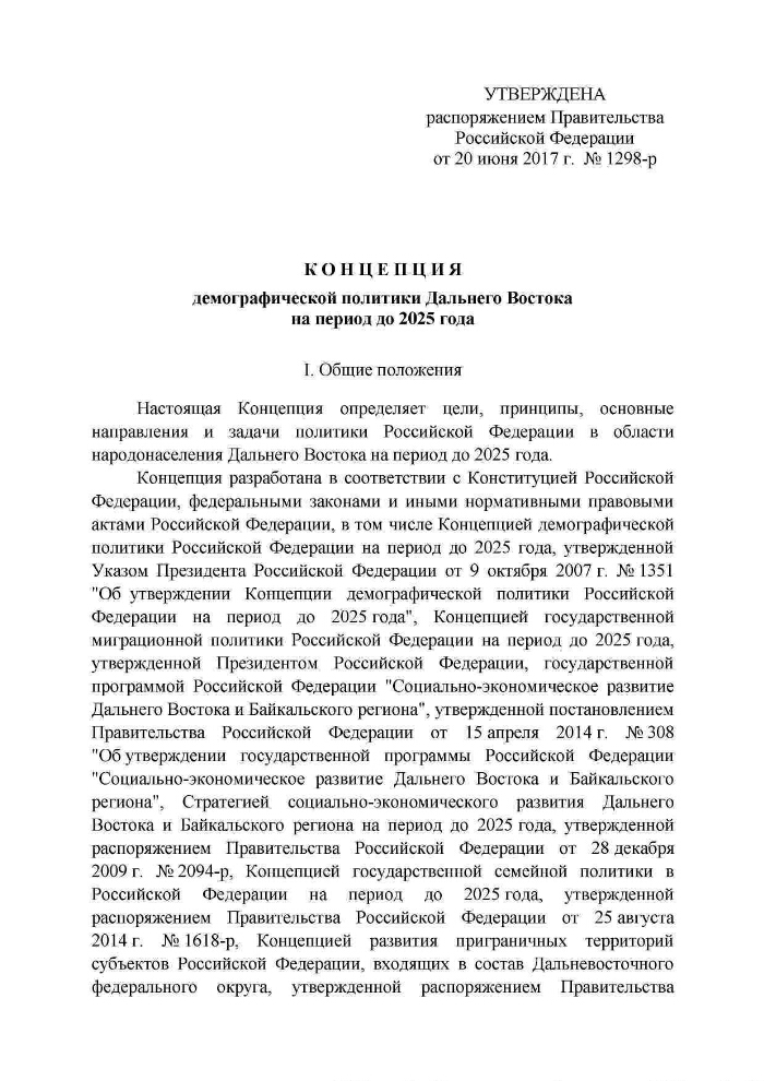 [Об утверждении Концепции демографической политики Дальнего Востока на период до 2025 года] : Распоряжение Правительства Российской Федерации от 20 июня 2017 г. № 1298-р. - Москва, 2017. -1, 25 листов. - В конце текста подпись: Председатель Правительства Российской Федерации Д. Медведев. Место подписания: Москва. Электронная версия правового акта (26 файлов, JPEG : 23,2 МБ). Содержит: Концепция демографической политики Дальнего Востока на период до 2025 года : утверждена Распоряжением Правительства Российской Федерации от 20 июня 2017 г. № 1298-р. - Опубликовано в изданиях: Собрание законодательства Российской Федерации от 2017 г., № 27, ст. 4062 ; Официальный интернет-портал правовой информации (www.pravo.gov.ru) от 28.6.2017 г. (№ 0001201706280011). Правительство Российской Федерации, сайт. http://government.ru/.