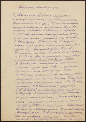 Творческая автобиография : [рукопись] / Михаил Аникушин. - 5 января 1958. -2 листа, бумага. - Режим доступа: интернет-портал Президентской библиотеки. Электронная версия (4 файла, 300 dpi, JPEG, 9,5 МБ). Рукописный текст, перьевая фиолетовая ручка, текст на обеих сторонах листа. Копирование пользователями не разрешается. Рукопись творческой автобиографии Михаила Константиновича Аникушина включает записи за период c 1935 по 1957 гг. В конце текста собственноручная подпись и дата: 5 января 1958 г.
