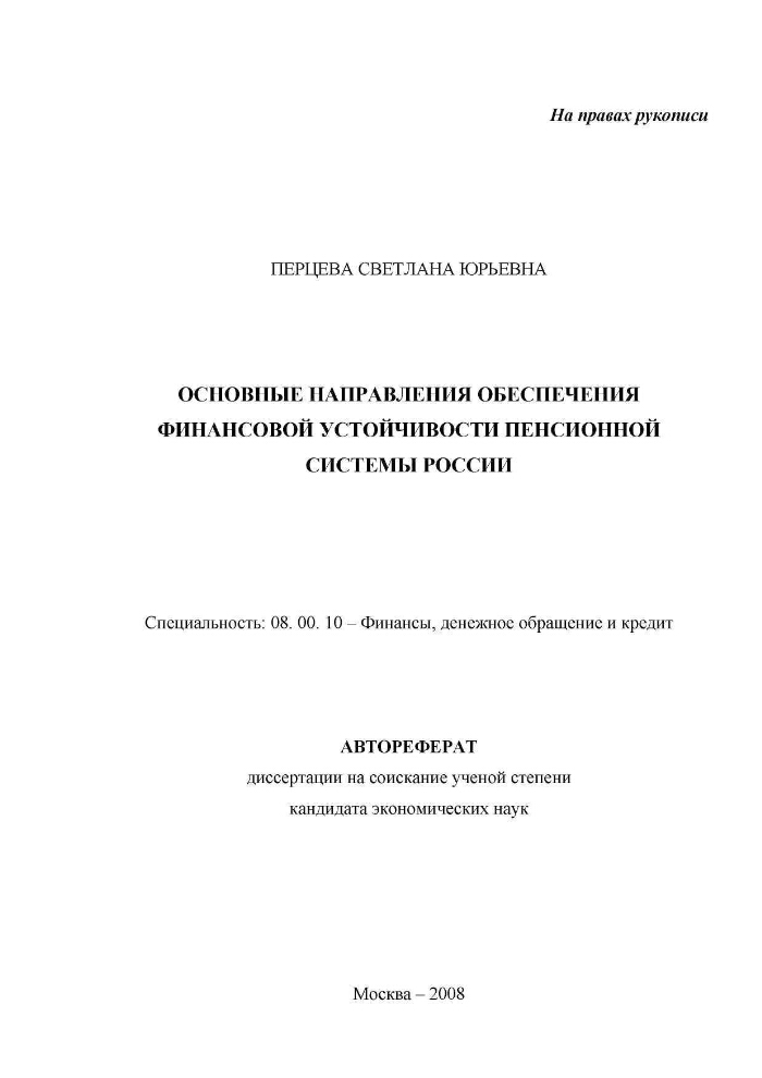 Основные направления обеспечения финансовой устойчивости пенсионной системы России : автореф. дис. на соиск. учен. степ. канд. экон. наук : специальность 08.00.10 / Перцева Светлана Юрьевна ; [Акад. труда и соц. отношений]. - Москва, 2008. -24 с. ; 21 см.. - Библиогр.: с. 24 (6 назв.). . -100 экз.