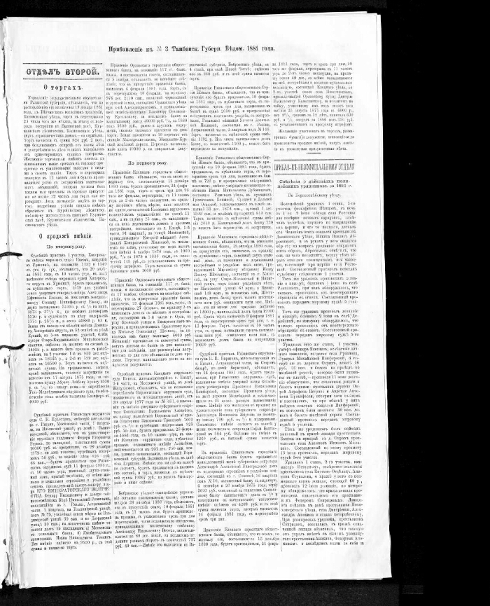 Тамбовские губернские ведомости. - 1838, 8 января - [?]. -Тамбов, 1838-1917. - Газета издавалась при Тамбовском Губернском Правлении с 1838 г. Первоначально выходила еженедельно, с половины 1876 г. 2 раза в неделю, с половины 1877 г. выходила 3 раза в неделю. С 1838 по 1 марта 1907 выходили в 2 части: официальная и неофициальная; с 1838 по март 1845 неофициальная часть издавалась как прибавление к номеру. Библиография: Указатель статей, помещенных в неофициальном отделе "Тамбовских губернских ведомостей" за 1870 - 1877 гг. / М. П. Григоровский ; Указатель статей, помещенных в неофициальном отделе "Тамбовских губернских ведомостей" за 1838 - 1840 гг. / Соловский В. В. ; Указатель статей, помещенных в неофициальном отделе "Тамбовских губернских ведомостей" за 1841 - 1842 гг.