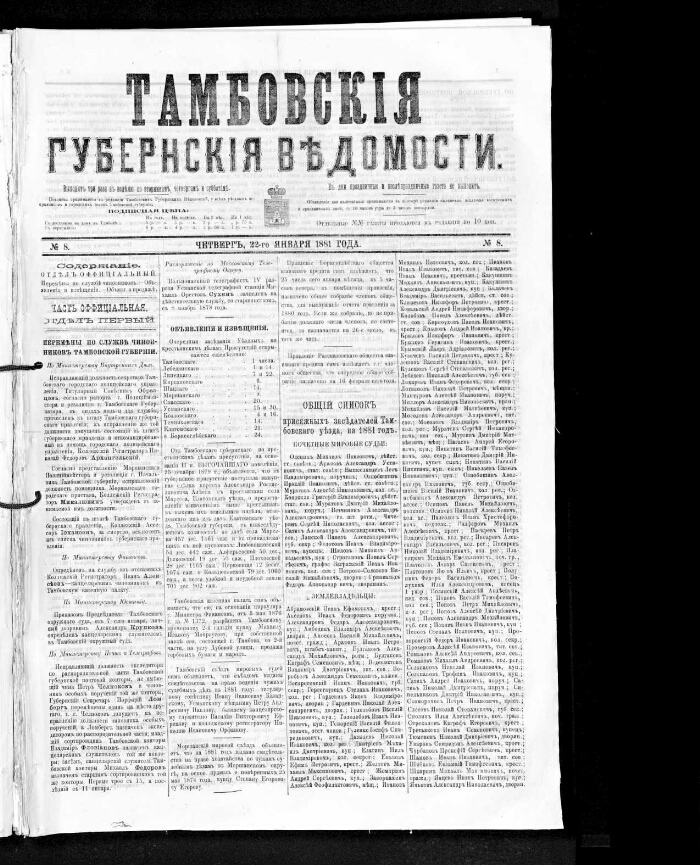 Тамбовские губернские ведомости. - 1838, 8 января - [?]. -Тамбов, 1838-1917. - Газета издавалась при Тамбовском Губернском Правлении с 1838 г. Первоначально выходила еженедельно, с половины 1876 г. 2 раза в неделю, с половины 1877 г. выходила 3 раза в неделю. С 1838 по 1 марта 1907 выходили в 2 части: официальная и неофициальная; с 1838 по март 1845 неофициальная часть издавалась как прибавление к номеру. Библиография: Указатель статей, помещенных в неофициальном отделе "Тамбовских губернских ведомостей" за 1870 - 1877 гг. / М. П. Григоровский ; Указатель статей, помещенных в неофициальном отделе "Тамбовских губернских ведомостей" за 1838 - 1840 гг. / Соловский В. В. ; Указатель статей, помещенных в неофициальном отделе "Тамбовских губернских ведомостей" за 1841 - 1842 гг.
