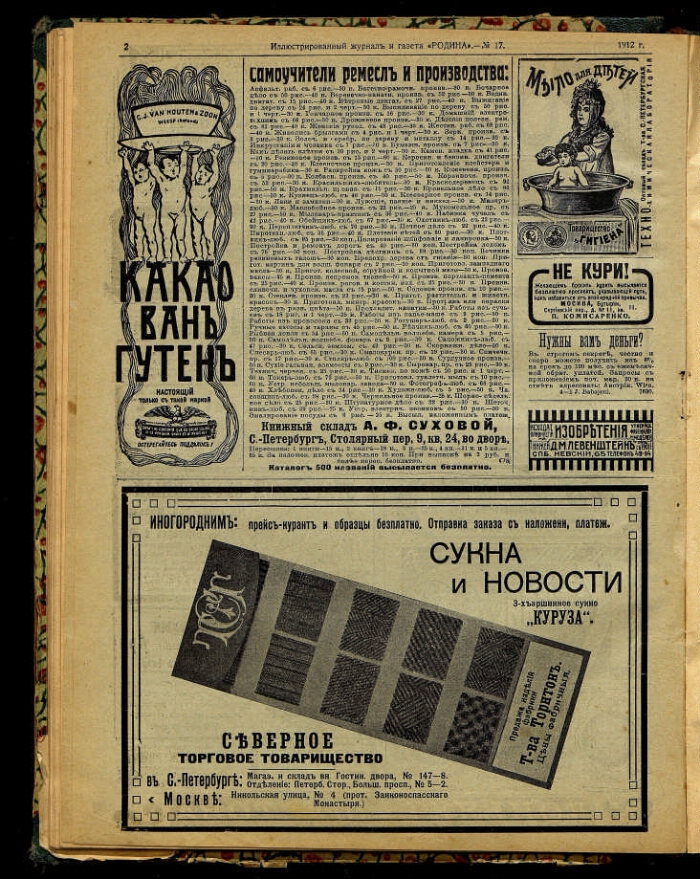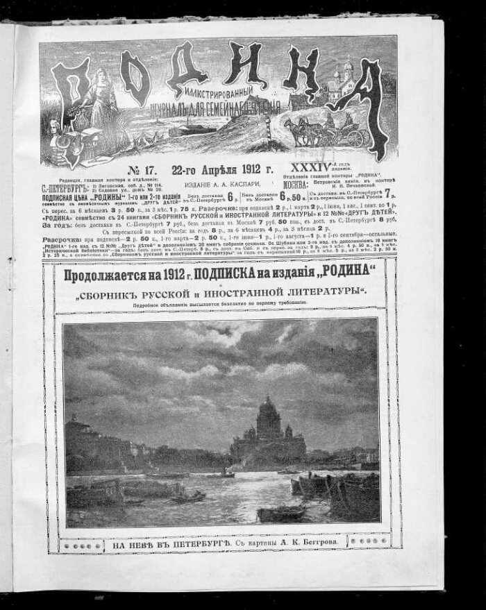 Родина : литературно-художественный семейный журнал с иллюстрированными отделами "Всемирное обозрение" и "Развлечение в часы отдыха". - Санкт-Петербург : Акционерное общество издательства А. А. Каспари, 1879-1917. - "Родина" - иллюстрированный журнал для семейного чтения, основан в Санкт-Петербурге в 1879 г. В. А. Захаровым, выходил ежемесячно, с 1883 г. – еженедельно. В 1879-1880 гг. выходило с приложением "Вестник народной помощи"; за 1884 г. - с приложением "Прогрессивное сельское хозяйство". В 1886 г. журнал приобрёл А. А. Каспари. С этого времени журнал начинает печатать ежемесячные приложения ("Развлечение в часы отдыха", иллюстрированное "Всемирное обозрение", еженедельная политическая и общественная газета "Родина") и до 1917 года издавался под его редакцией. С августа 1883 г. журнал реорганизован в газету и вновь начинает нумерацию выпусков. В 1888-1912 гг. издание выходит 2-мя параллельными частями с заглавием "Родина: еженедельный иллюстрированный журнал для семейного чтения" и "Родина: еженедельная газета политическая, общественная и литературная"; к каждому году имеется общий титульный лист с заглавием: "Родина: еженедельный иллюстрированный литературный журнал и политическая общественная газета"; На № 52 1911 г. самостоятельное издание газеты прекращено; в 1912 г. в каждом номере журнала имеется газетный отдел с заглавием: "Родина: еженедельные обзоры политики и общественной жизни: газетный отдел журнала "Родина". К 1917 г. выходило с приложением "Свободная Россия". Подзаголовок: 1878 Кн. 1 Народный журнал (с картинами); 1879 Кн. 2 - 1883 июнь/июль Ежемесячный журнал с картинами (с незначительными изменениями); 1883 № 1 (август) - 1885 Еженедельнная газета общественная и литературная; 1886-1887 Еженедельная иллюстрированная газета политическая, общественная и литературная (с незначительными изменениями); В журнале: 1888-1916 Иллюстрированный журнал для семейного чтения. (На обложке 1907 г. Литературно-художественный журнал и газета с иллюстрированными отделами "Всемирное обозрение" и "Развлечение в часы отдыха"; 1908-1916: Литературно-художественный семейный журнал с иллюстрированными отделами "Всемирное обозрение" и "Развлечение в часы отдыха"; в части номеров 1915-1916 г.: Еженедельный иллюстрированный журнал с бесплатным приложением и книгами романов); 1917 Еженедельный литературно-художественный журнал (На обложке: Литературно-художественный семейный журнал, в части номеров: ... с иллюстрированными отделами "Всемирное обозрение" и "Развлечение", в части номеров: Еженедельный иллюстрированный журнал с бесплатным приложением и книгами романов); В газете: 1888-1901 № 48 Еженедельная газета политическая, общественная и литературная; 1901 № 49 - 1903 Еженедельня газета. Политика, новости дня, общественная жизнь и пр.; 1904-1911 Еженедельная общественная и политическая газета (С 1909 г. ... Бесплатное приложение к журналу "Родина"). Издательство: 1879 - 1884 № 17 А. Траншель; 1884 № 18 - 1886 № 6, 16-17 И. Н. Пономарев; 1886 № 7-15 И. Н. Пономарев и В. М. Антонов; 1886 № 18 - 1913 № 42 А. А. Каспари; 1913 № 43 - 1914 № 34 издательница А. А. Каспари; 1914 № 35 - 1917 Акционерное общество издательства А. А. Каспари.