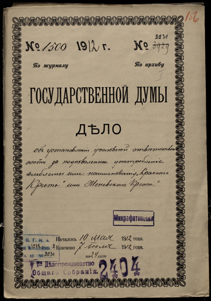 | Заголовок | Дело по законопроекту Министерства юстиции, внесенному в Государственную думу Третьего созыва, об установлении уголовной ответственности учреждений и обществ за употребление без разрешения эмблемы или наименования "Красный крест" и "Женевский крест" |