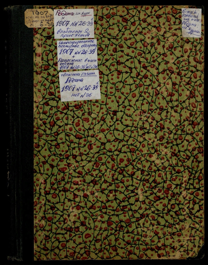 Родина : литературно-художественный семейный журнал с иллюстрированными отделами "Всемирное обозрение" и "Развлечение в часы отдыха". - Санкт-Петербург : Акционерное общество издательства А. А. Каспари, 1879-1917. - "Родина" - иллюстрированный журнал для семейного чтения, основан в Санкт-Петербурге в 1879 г. В. А. Захаровым, выходил ежемесячно, с 1883 г. – еженедельно. В 1879-1880 гг. выходило с приложением "Вестник народной помощи"; за 1884 г. - с приложением "Прогрессивное сельское хозяйство". В 1886 г. журнал приобрёл А. А. Каспари. С этого времени журнал начинает печатать ежемесячные приложения ("Развлечение в часы отдыха", иллюстрированное "Всемирное обозрение", еженедельная политическая и общественная газета "Родина") и до 1917 года издавался под его редакцией. С августа 1883 г. журнал реорганизован в газету и вновь начинает нумерацию выпусков. В 1888-1912 гг. издание выходит 2-мя параллельными частями с заглавием "Родина: еженедельный иллюстрированный журнал для семейного чтения" и "Родина: еженедельная газета политическая, общественная и литературная"; к каждому году имеется общий титульный лист с заглавием: "Родина: еженедельный иллюстрированный литературный журнал и политическая общественная газета"; На № 52 1911 г. самостоятельное издание газеты прекращено; в 1912 г. в каждом номере журнала имеется газетный отдел с заглавием: "Родина: еженедельные обзоры политики и общественной жизни: газетный отдел журнала "Родина". К 1917 г. выходило с приложением "Свободная Россия". Подзаголовок: 1878 Кн. 1 Народный журнал (с картинами); 1879 Кн. 2 - 1883 июнь/июль Ежемесячный журнал с картинами (с незначительными изменениями); 1883 № 1 (август) - 1885 Еженедельнная газета общественная и литературная; 1886-1887 Еженедельная иллюстрированная газета политическая, общественная и литературная (с незначительными изменениями); В журнале: 1888-1916 Иллюстрированный журнал для семейного чтения. (На обложке 1907 г. Литературно-художественный журнал и газета с иллюстрированными отделами "Всемирное обозрение" и "Развлечение в часы отдыха"; 1908-1916: Литературно-художественный семейный журнал с иллюстрированными отделами "Всемирное обозрение" и "Развлечение в часы отдыха"; в части номеров 1915-1916 г.: Еженедельный иллюстрированный журнал с бесплатным приложением и книгами романов); 1917 Еженедельный литературно-художественный журнал (На обложке: Литературно-художественный семейный журнал, в части номеров: ... с иллюстрированными отделами "Всемирное обозрение" и "Развлечение", в части номеров: Еженедельный иллюстрированный журнал с бесплатным приложением и книгами романов); В газете: 1888-1901 № 48 Еженедельная газета политическая, общественная и литературная; 1901 № 49 - 1903 Еженедельня газета. Политика, новости дня, общественная жизнь и пр.; 1904-1911 Еженедельная общественная и политическая газета (С 1909 г. ... Бесплатное приложение к журналу "Родина"). Издательство: 1879 - 1884 № 17 А. Траншель; 1884 № 18 - 1886 № 6, 16-17 И. Н. Пономарев; 1886 № 7-15 И. Н. Пономарев и В. М. Антонов; 1886 № 18 - 1913 № 42 А. А. Каспари; 1913 № 43 - 1914 № 34 издательница А. А. Каспари; 1914 № 35 - 1917 Акционерное общество издательства А. А. Каспари.