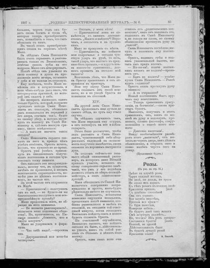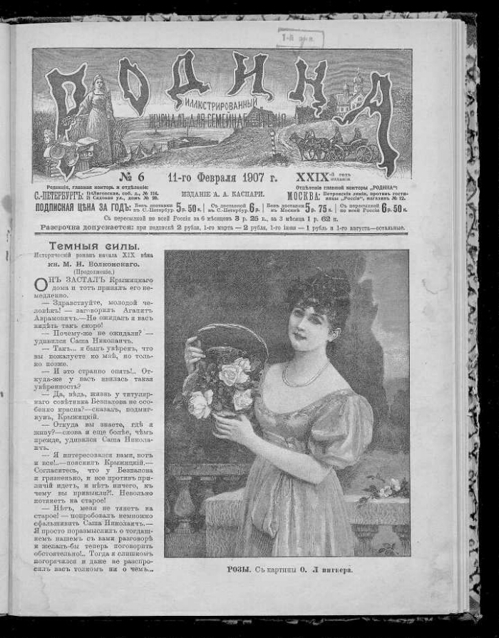 Родина : литературно-художественный семейный журнал с иллюстрированными отделами "Всемирное обозрение" и "Развлечение в часы отдыха". - Санкт-Петербург : Акционерное общество издательства А. А. Каспари, 1879-1917. - "Родина" - иллюстрированный журнал для семейного чтения, основан в Санкт-Петербурге в 1879 г. В. А. Захаровым, выходил ежемесячно, с 1883 г. – еженедельно. В 1879-1880 гг. выходило с приложением "Вестник народной помощи"; за 1884 г. - с приложением "Прогрессивное сельское хозяйство". В 1886 г. журнал приобрёл А. А. Каспари. С этого времени журнал начинает печатать ежемесячные приложения ("Развлечение в часы отдыха", иллюстрированное "Всемирное обозрение", еженедельная политическая и общественная газета "Родина") и до 1917 года издавался под его редакцией. С августа 1883 г. журнал реорганизован в газету и вновь начинает нумерацию выпусков. В 1888-1912 гг. издание выходит 2-мя параллельными частями с заглавием "Родина: еженедельный иллюстрированный журнал для семейного чтения" и "Родина: еженедельная газета политическая, общественная и литературная"; к каждому году имеется общий титульный лист с заглавием: "Родина: еженедельный иллюстрированный литературный журнал и политическая общественная газета"; На № 52 1911 г. самостоятельное издание газеты прекращено; в 1912 г. в каждом номере журнала имеется газетный отдел с заглавием: "Родина: еженедельные обзоры политики и общественной жизни: газетный отдел журнала "Родина". К 1917 г. выходило с приложением "Свободная Россия". Подзаголовок: 1878 Кн. 1 Народный журнал (с картинами); 1879 Кн. 2 - 1883 июнь/июль Ежемесячный журнал с картинами (с незначительными изменениями); 1883 № 1 (август) - 1885 Еженедельнная газета общественная и литературная; 1886-1887 Еженедельная иллюстрированная газета политическая, общественная и литературная (с незначительными изменениями); В журнале: 1888-1916 Иллюстрированный журнал для семейного чтения. (На обложке 1907 г. Литературно-художественный журнал и газета с иллюстрированными отделами "Всемирное обозрение" и "Развлечение в часы отдыха"; 1908-1916: Литературно-художественный семейный журнал с иллюстрированными отделами "Всемирное обозрение" и "Развлечение в часы отдыха"; в части номеров 1915-1916 г.: Еженедельный иллюстрированный журнал с бесплатным приложением и книгами романов); 1917 Еженедельный литературно-художественный журнал (На обложке: Литературно-художественный семейный журнал, в части номеров: ... с иллюстрированными отделами "Всемирное обозрение" и "Развлечение", в части номеров: Еженедельный иллюстрированный журнал с бесплатным приложением и книгами романов); В газете: 1888-1901 № 48 Еженедельная газета политическая, общественная и литературная; 1901 № 49 - 1903 Еженедельня газета. Политика, новости дня, общественная жизнь и пр.; 1904-1911 Еженедельная общественная и политическая газета (С 1909 г. ... Бесплатное приложение к журналу "Родина"). Издательство: 1879 - 1884 № 17 А. Траншель; 1884 № 18 - 1886 № 6, 16-17 И. Н. Пономарев; 1886 № 7-15 И. Н. Пономарев и В. М. Антонов; 1886 № 18 - 1913 № 42 А. А. Каспари; 1913 № 43 - 1914 № 34 издательница А. А. Каспари; 1914 № 35 - 1917 Акционерное общество издательства А. А. Каспари.