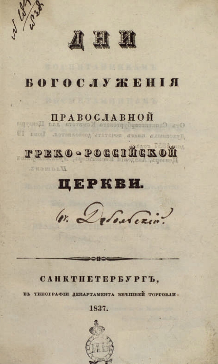 Дни богослужения православной греко-российской церкви / [Свящ. и законоучитель магистр Григорий Дебольский]. - Санкт-Петербург : тип. Деп. внеш. торговли, 1837. -[8], 380, VIII с. ; 21. - Авт. указан в конце посвящения.