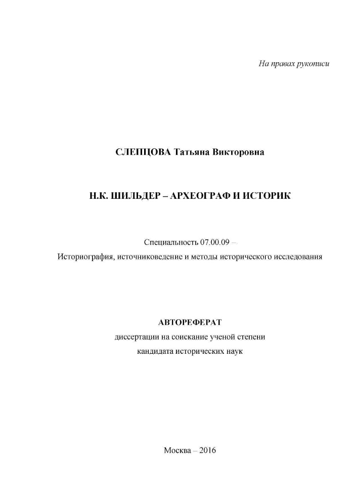 Н. К. Шильдер - археограф и историк : автореферат диссертации на соискание ученой степени кандидата исторических наук : специальность 07.00.09 / Слепцова Татьяна Викторовна ; [Российский университет дружбы народов (РУДН)]. - Москва, 2016. -30 с. : ил.. -100 экз.