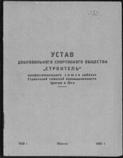 Устав Добровольного спортивного общества "Строитель" Профессионального союза рабочих строителей тяжелой промышленности Центра и Юга : [утвержден 2-й Всесоюзной конференцией ДСО "Строитель", 16-19 мая 1938 г., г. Харьков]. - Москва : [типография Комбината печати Постоянной Всесоюзной строительной выставки], 1938. -16 с. ; 15 см. -