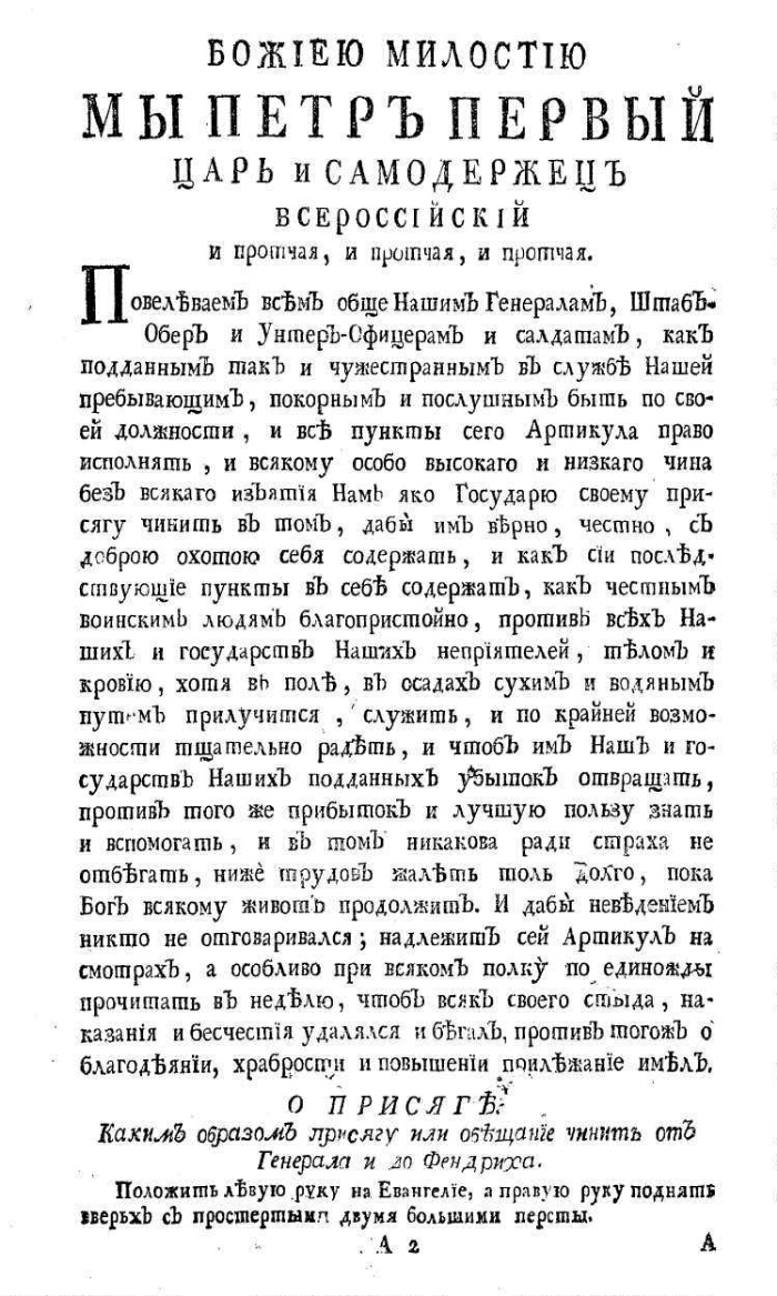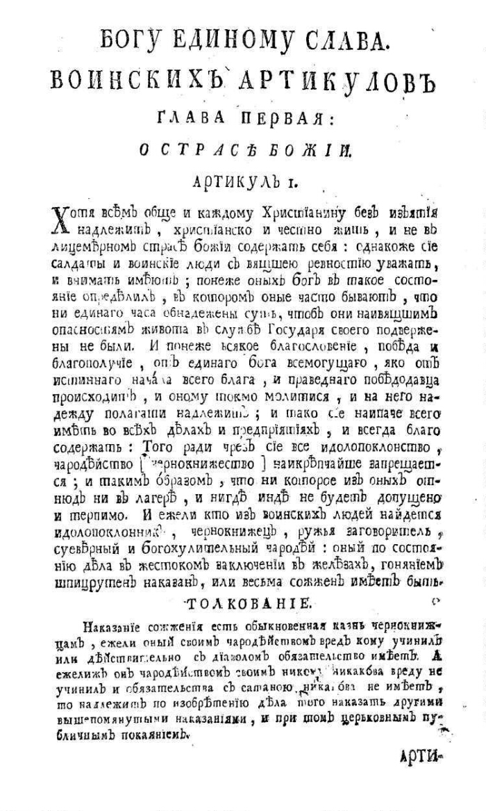 Артикул воинский : С кратким толкованием и с процессами, / Напечатася повелением ея императорскаго величества. - Печатан 3-м тиснением. -[СПб]. : При Имп. Акад. наук, 1777. -146 с. ; 4°. - Тираж 1686 экз. Напечатано на счет Сената. "Экзерциции, приготовление к маршу, звания и должности полковых чинов, напечатася повелением ея имп. величества. Печатаны 3-м тиснением при Имп. Академии наук 1777 года" (С.103-146) с отд. тит. л.. - СК XVIII.