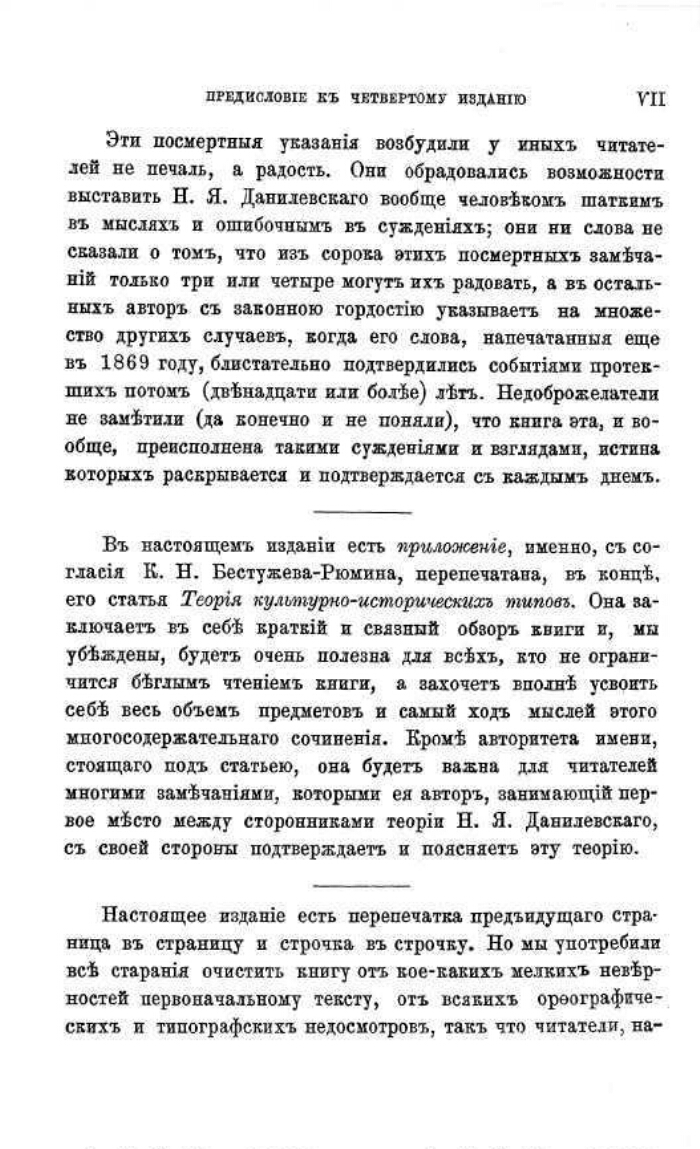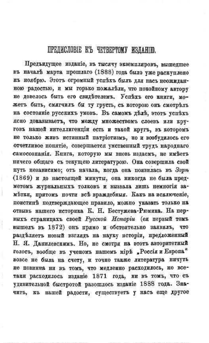 Россия и Европа : взгляд на культурные и политические отношения славянского мира к германо-романскому / Н. Я. Данилевский. - Издание 5-е, с посмертными примечаниями, статьей К. Н. Бестужева-Рюмина и указателями предметов и имен. -С.-Петербург : Издание Н. Страхова, 1895. -XLII, 629 с. ; 22 см. - Первая публикация работ в журнале "Заря" считалась первым изданием. Содержит также: Жизнь и труды Н. Я. Данилевского / Н. Страхов (с. IX-XXXI). Теория культурно-исторических типов / К. Н. Бестужев-Рюмин (с. 559-610). - Список сочинений Н. Я. Данилевского: стр. XXXI-XXXV. - Указатели предметов и имен: стр. 611-629.