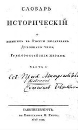 Словарь исторический о бывших в России писателях духовнаго чина, грекороссийския церкви. - Санктпетербург : В типографии Н. Греча, 1818. - 8° (20 см.). - В мае 1815 г. состоялось обсуждение рукописи в Обществе истории и древностей российских, куда она была передана автором еще в 1812 г. Общество фактически устранилось от издания книги. В 1818 г. "Словарь" был переведен на нем., а 1819 г. - на швед. яз. В исправленном и дополненном виде переиздан в 1827 г. в Петербурге. Вошедщие в книгу биографии в 1805 -1806 гг. печатались в журн. "Друг просвещения". Ценз. : И.О. Тимковский, 8 марта, 24 сент. 1818 г. Книга издана на счет Н.П. Румянцева. При подготовке рукописи к печати автор учел замечания В.Г. Анастасевича, который осуществлял также корректуру издания.Выручка от продажи части тиража пошла на уплату работы Анастасевича. Однако низкий полиграфический уровень и обилие опечаток ( см. также рец.: Сын Отечества. - 1818. - Ч.50,№ 47. - С. 82 - 83) побудили автора снять свое имя с титульного листа и отказаться от предисловия. Герб Н.П. Румянцева, помещавшийся на книгах, изданных за его счет, также был снят. Сводный каталог русской книги 1801-1825 гг.