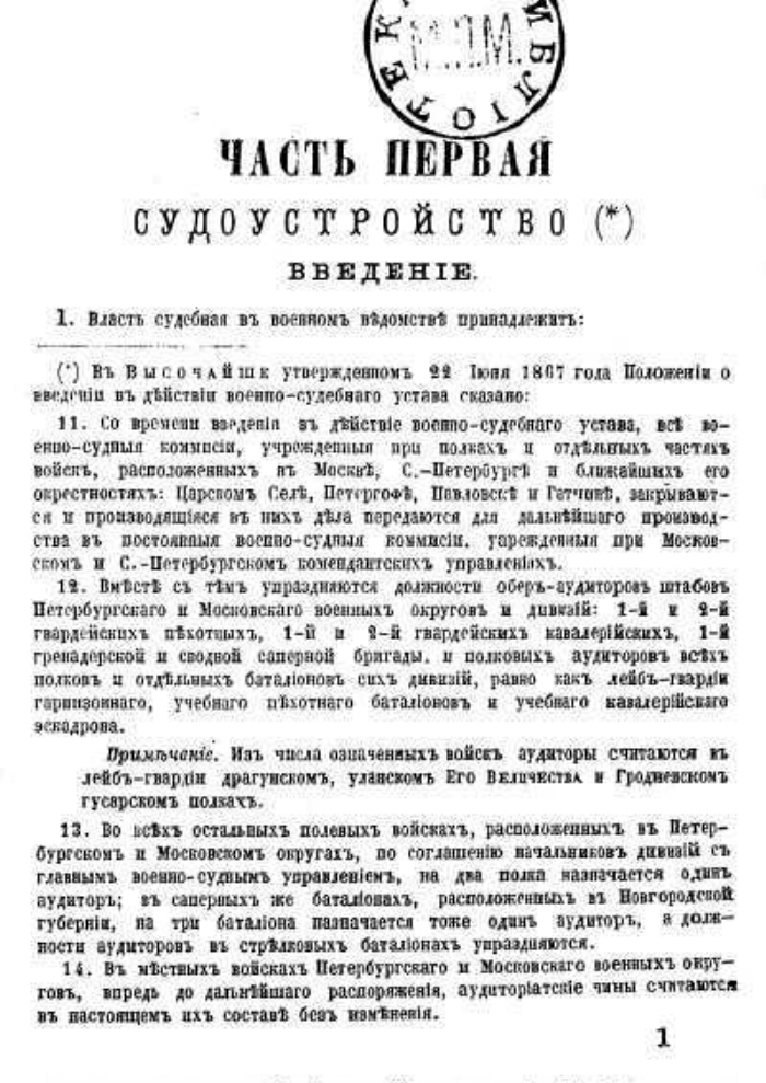 Военно-судебный устав (полное издание), выс. утв. 15 мая 1867 г. : Со включением: 1. Приказа военного министра 20 мая 1867 г. с правилами для руководства при наложении наказаний. 2. Положений о взысканиях дисциплинарных. 3. Выс. утв. мнений Гос. совета и др. - Москва : Погорелкин, 1868. -[2], 447 с. ; 16. -