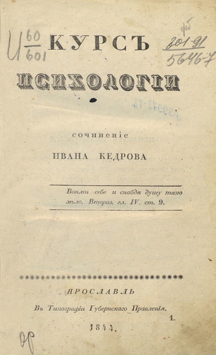 Автор Кедров Иван Андреевич Описание Кедров, Иван Андреевич (1811-1846). Курс психологии : Соч. Ивана Кедрова. - Ярославль : тип. Губ. правл., 1844. -[4], 326 с. ; 22. - . Источник электронной копии: РГБМесто хранения оригинала: U 60/601 ; T 113/46 Издательство тип. Губ. правл.