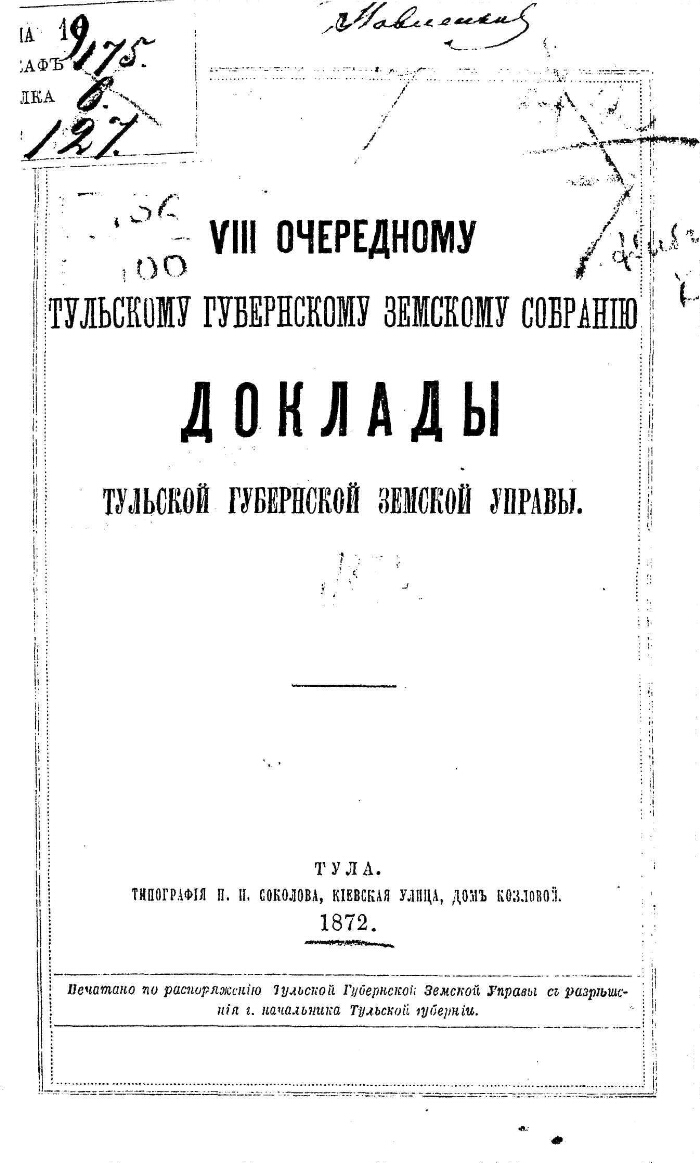 Доклады Тульской губернской земской управы ... Губернскому земскому собранию. - Тула : Тип. Н. И. Соколова, 1866-1900. - 21 см. -