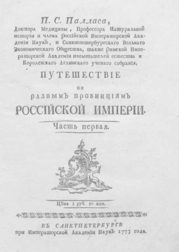 П.С.Палласа, доктора медицины, профессора натуральной истории и члена Российской императорской Академии наук, и Санктпетербургскаго Вольнаго экономическаго общества, также Римской императорской академии изпытателей естества и Королевскаго Аглинскаго ученаго собрания, Путешествие по разным провинциям Российской империи. - Санктпетербург : При Имп. Акад. наук, 1773-1788. - 4°. - Загл. ч.3 (половина 1 и 2): Петра Симона Палласа, медицины доктора, натуральной истории профессора, Санктпетербургской императорской Академии наук и Вольнаго экономическаго общества, Римской императорской академии, Королевскаго Аглинскаго собрания и Берлинскаго естествоеспытательнаго общества члена Путешествие по разным провинциям российскаго государства. перевел Василий Зуев. Загл. ч.2 кн.1 и 2: Петра Симона Палласа, медицины доктора, естественной истории профессора, Российской императорской Академии наук, Вольнаго экономическаго санктпетербургскаго общества, Римской императорской естествоиспытательной академии и Королевских Аглинскаго, Шведскаго и Геттингскаго собраниев члена Путешествие по разным местам российскаго государства по повелению Санктпетербургской императорской Академии наук, с немецкаго языка на российской перевел бунчуковый товарищь Федор Томанский, Императорской Академии наук, Королевскаго Прусскаго немецкаго собрания корреспондент, и учрежденнаго при Московском императорском университете российскаго собрания член. На рус. яз. ч.1 пер. С.И. Волков и В.Г. Костыгов (последний пер. прибавление), ч.2-ю пер. Ф.О. Туманский, ч.3 - В.Ф.Зуев. Карты гравировали Н. Зубков, А. Медведев, А. Рыков, Л. Сергеев, С. Силунов, К. Фролов, П. Холодов. Ч.1 изд. Собр., старающимся о пер. иностр. кн. Загл. ориг.: Reise durch verschiedene Provinzen des Ru?ischen Reichs. Th.1-3. 1771-1776. Тираж 600 экз. Ил. отпеч. с досок, использованных в изд. на нем. яз. На досках дополнительно выгравирован рус. текст. Ил. к ч.3 с добавлением рус. текста встречаются только в более поздних отт. - на бумаге с водяным знаком 1802 г. В конце каждой части в виде прибавления дано описание животных и растений.. - СК XVIII.