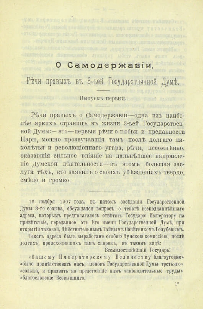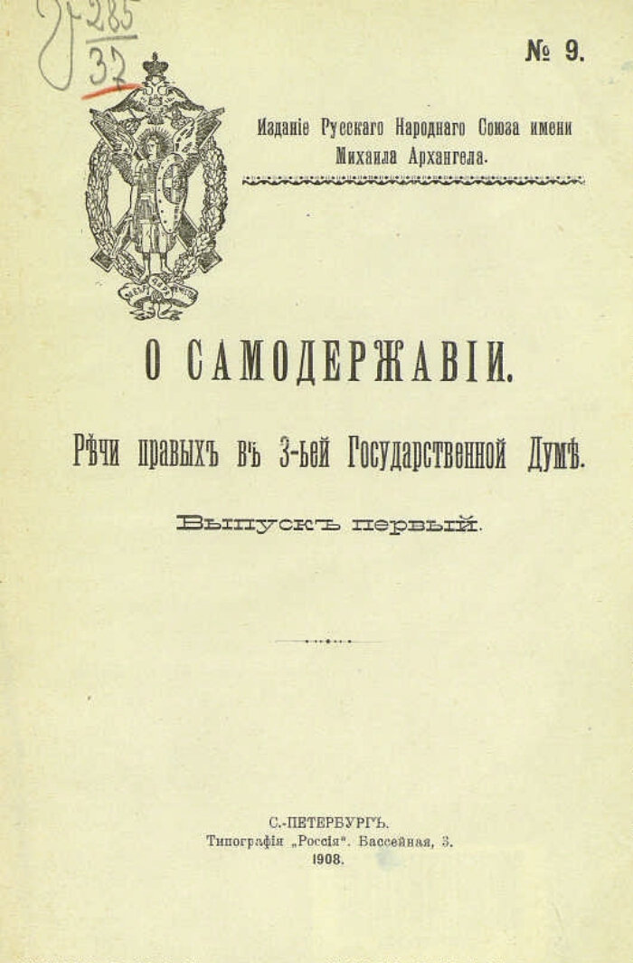 О самодержавии : речи правых в 3-ей Государственной Думе. - Санкт-Петербург : Русский Народный Союз им. М. Архангела, 1908-. - 21 см