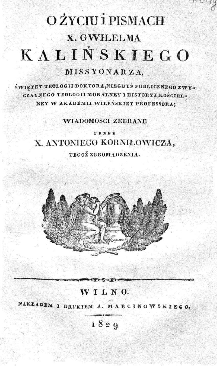 O Zyciu i pismach X. Gwelelma Kalinskiego missyonarza, swietey teologii doktora, niegdys publicznego zwyczaynego teologii moralney i historyi koscielney w akademii wilenskiey professora / wiadomosci zebrane przez X. Antoniego Kornilowicza tegocz zgromadzenia. - Wilno : Nakladem i drukiem A. Marcinowskiego, 1829. -32 с. ; 8° (20 cм). - Припл. к: Феофан (Прокопович Е.). Краткая повесть о смерти Петра Великаго императора российскаго. - Санктпетербург, 1819.