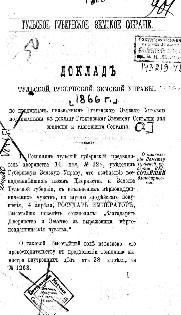 Доклады Тульской губернской земской управы ... Губернскому земскому собранию. [1866 г.]