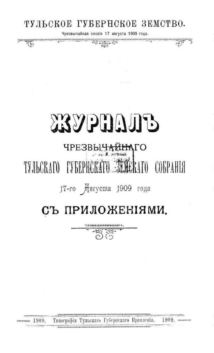 Журналы ... Тульского губернского земского собрания ... - Тула : Тип. Н. И. Соколова, 1866-1917. - 22-24 см. - В части изд. загл. незначит. изменено. Надзаг. журн. за ряд лет не указан.