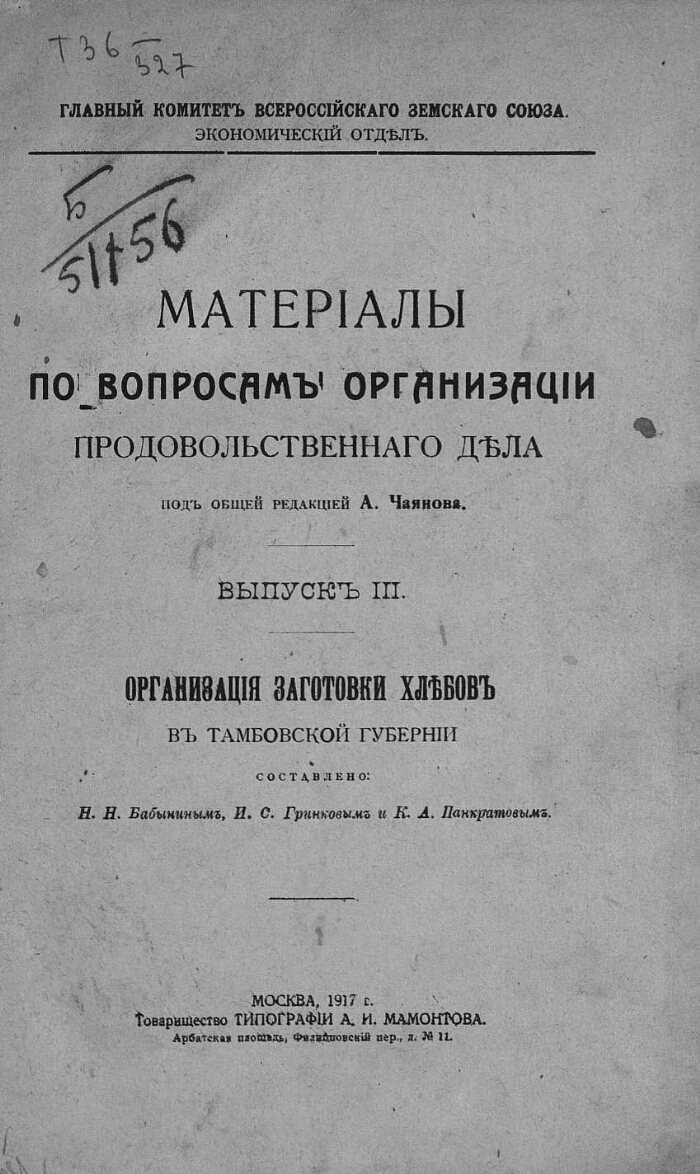 Вып. 3: Организация заготовки хлебов в Тамбовской губернии : [с приложениями] / составлено Н. Н. Бобыниным, Е. И. Буниным, Н. С. Гринковым, К. А. Панкратовым, В. Ф. Семешко и Е. А. Яковлевым ; [предисловие: заведующий Продовольственным отделом А. Чаянов]. - 1916 (обл. 1917). -228 с., 6 л. ил., карт. ; 26 см. -