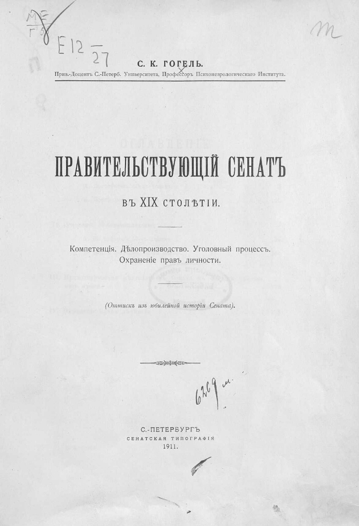 Правительствующий сенат в XIX столетии : Компетенция. Делопроизводство. Уголовный процесс. Охранение прав личности / С. К. Гогель, приват-доцент С.-Петербургского университета, профессор Психоневрологического института. - С.-Петербург : Сенатская типография, 1911. -[2], 208 с. ; 31 см. - Оттиск из юбилейной истории Сената. - На форзаце наклейка: Библ. Московск. педагогич. собрания: инв. 6269.