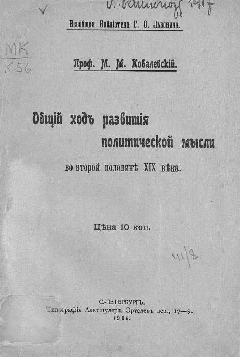Общий ход развития политической мысли во второй половине XIX века / проф. М. М. Ковалевский. - Санкт-Петербург : типография Альтшулера, 1905. -47 с. ; 20 см. - (Всеобщая библиотека Г. Ф. Львовича). - Библиография в подстрочных примечаниях.