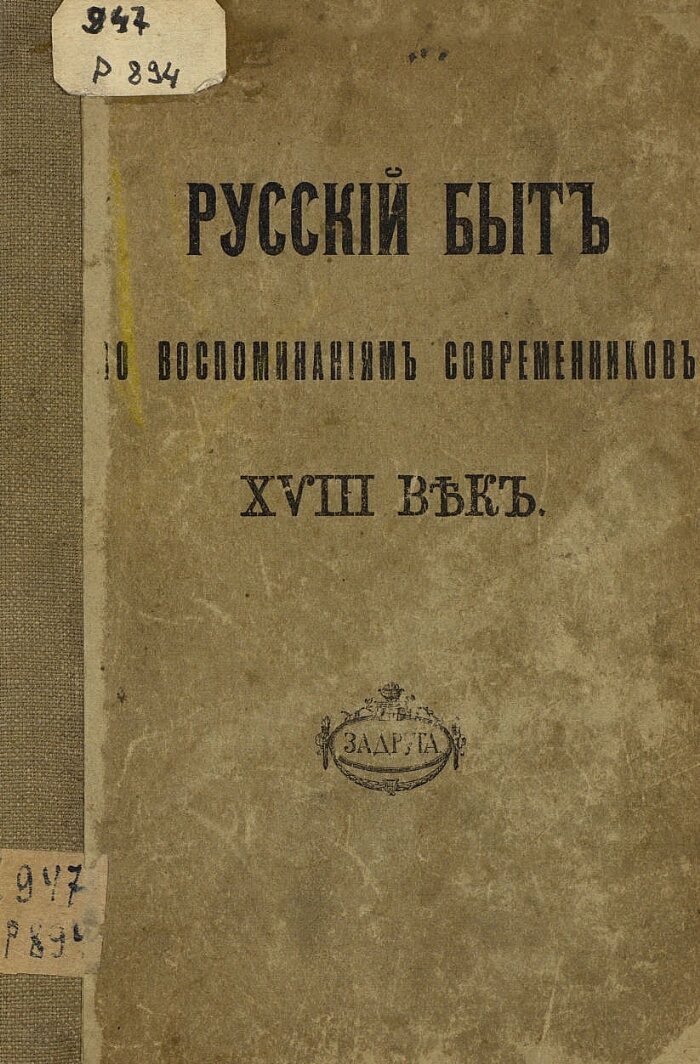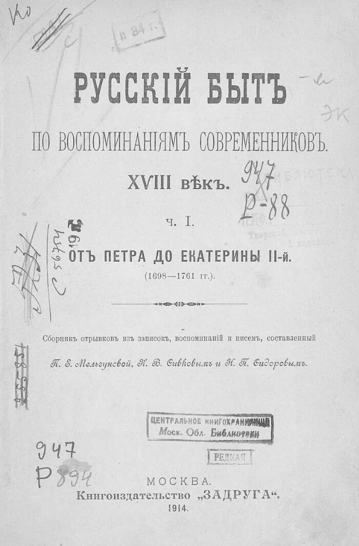 Русский быт по воспоминаниям современников : XVIII век : сборник отрывков из записок, воспоминаний и писем, составленный П. Е. Мельгуновой, К. В. Сивковым и Н. П. Сидоровым : Ч. 1-2. - Москва : Кн-во "Задруга", 1914-1923. -4 т. ; 22 см. - На обложке ч. 2 вып. 3 серия: Историческая библиотека.