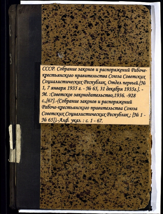 Собрание законов и распоряжений Рабоче-крестьянского правительства Союза Советских Социалистических Республик : издаваемое Управлением делами Совета народных комиссаров Союза ССР и Совета труда и обороны. Отдел первый. - Москва, 1924-1937. - 23 см. - Заглавие: 1924-1937 (Отд. 1-й и 2-й) Собрание законов и распоряжений Рабоче-крестьянского правительства Союза Советских Социалистических Республик ; 1938 № 1 (март) - 1946 № 4 Собрание постановлений и распоряжений Правительства Союза Советских Социалистических Республик ; 1946 № 5 - 1949 Собрание постановлений и распоряжений Совета Министров Союза Советских Социалистических Республик ; № 1 (1957) - Собрание постановлений Правительства Союза Советских Социалистических Республик. Подзаг.: 1924-1937 (Отд. 1-й и 2-й) Издаваемое Управлением делами Совета народных комиссаров Союза ССР (в 1926 (Отд. 1-й) № 75-77 (Отд. 2-й) № 39, 1927 № 1-12, 14-17, 19-33, 34-45 - 1934 ... и Совета труда и обороны). Издательство: 1924-1925 Отдел опубликования законов Управления делами Совета народных комиссаров СССР ; 1926-1930 Отдел опубликования законов Управления делами Совета народных комиссаров СССР и СТО, Управление делами СНК СССР и СТО ; 1931-1937 (Отд. 1-й) № 1-8 (Отд. 2-й) № 1-4 "Советское законодательство" ; 1937 (Отд. 1-й) № 9-76, (Отд. 2-й) № 5-38 Юридическое издательство НКЮ СССР. Выходит в 2-х отделах: Отдел первый и Отдел второй.
