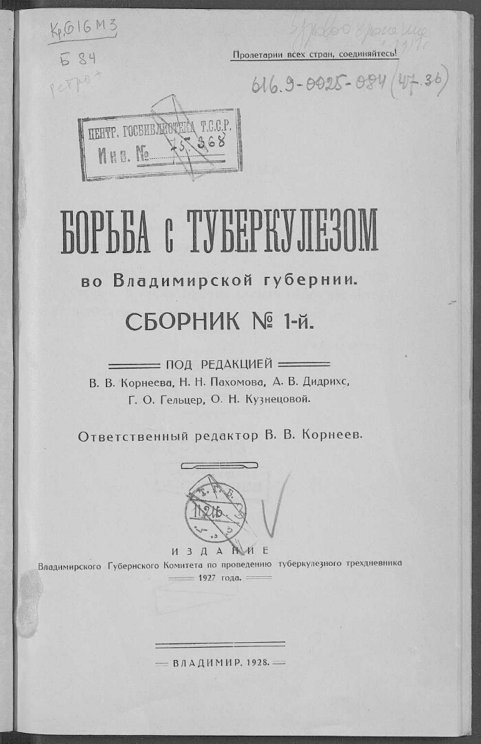 Борьба с туберкулезом во Владимирской губернии : сборник № 1- / под ред. В. В. Корнеева, Н. Н. Пахомова, А. В. Дидрихс ... [и др.] ; отв. ред. В. В. Корнеев. - Владимир : Владимир. губ. ком. по проведению туберкулезного трехдневника 1927 г., 1928. - 25 см. -