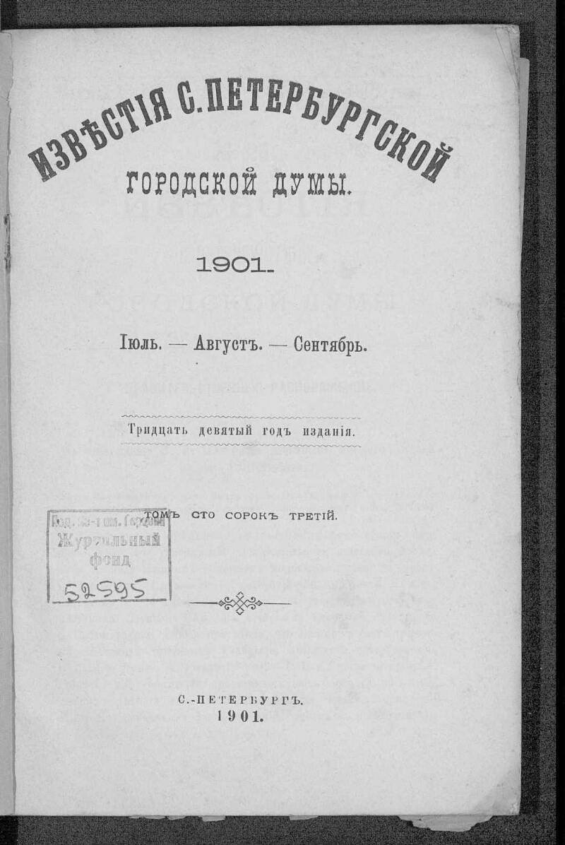 Известия С.-Петербургской городской думы. - 1863, № 1 - 1915, № 34. -Санкт-Петербург : [С.-Петербургское городское общественное управление], 1863-1915. - С № 35 (1915) по 1917 г. журнал выходил под заглавием: Известия Петроградской городской думы. Редакторы: с 1871 г. - В. Шелейховский ; с 1881, № 9 - Ф. В. Бестужев-Рюмин ; с 1887, № 24 - И. А. Зубарев ; с 1900 г. - К. Д. Кудрявцев. В 1907-1909 гг. в нумерации томов имеются ошибки. Приложения: 1901-1910 гг. - книги и брошюры по вопросам городского хозяйства, городского благоустройства и общественного управления ; 1907 Дневник Восьмого Русского водопроводного съезда 1907 г. в С.-Петербурге. С 1884 г. журнал выходил еженедельно. Предметный систематический указатель к Известиям С.-Петербургской городской думы по водопроводам с 1863-1890 гг. включительно / сост. К. И. Богданович. Ч. 1. 1906. 131 с. Приложение к: Известия С.-Петербургской городской думы. 1906, № 16.