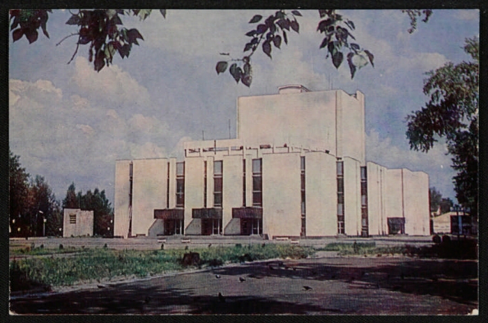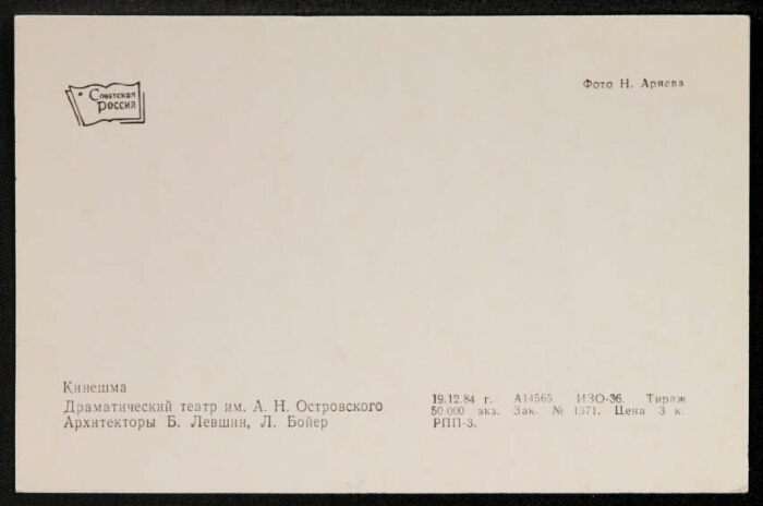 Электронная репродукция открытки: Кинешма. Драматический театр им. А. Н. Островского. Архитекторы Б. Левшин, Л. Бойер [Изоматериал] / фото Н. Аряева. Советская Россия, 1985. 1 открытка : цветной офсет. А 14565. Цена 3 коп. Тираж 50000 экз. Местонахождение: Детский музей открытки, Санкт-Петербург.