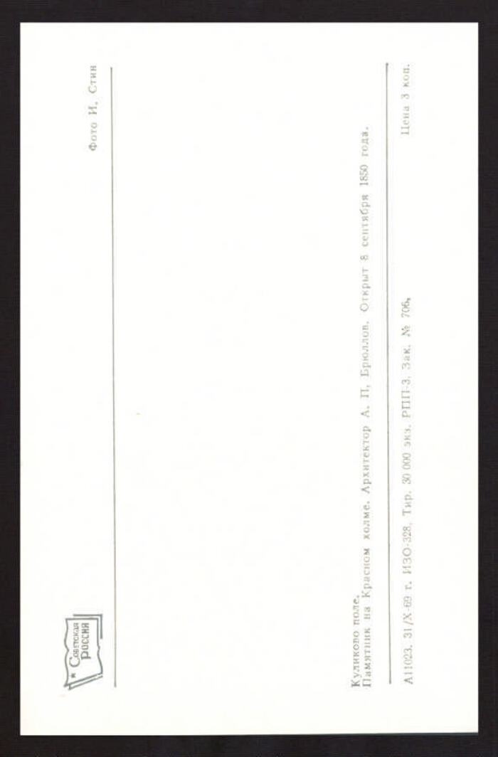 Куликово поле. Памятник на Красном холме. Архитектор А. П. Брюллов. Открыт 8 сентября 1850 года [Изоматериал : электронный ресурс] : [открытка] / фото И. Стин. - Электронные данные (2 файла, JPEG : 2,4МБ). -(Санкт-Петербург: Президентская библиотека , 2014). - Режим доступа: интернет-портал Президентской библиотеки. Заглавие с экрана. Открытка является частью комплекта: Куликово поле / фото И. Стин. Москва : Советская Россия, 1969. 8 открыток в обложке. Электронная репродукция открытки: Куликово поле. Памятник на Красном холме. Архитектор А. П. Брюллов. Открыт 8 сентября 1850 года [Изоматериал] / фото И. Стин. Советская Россия, 1969. 1 открытка : цветной офсет. А 11023. 3 коп. Тираж 30000 экз. Местонахождение: Детский музей открытки, Санкт-Петербург. Копирование пользователями не разрешается.