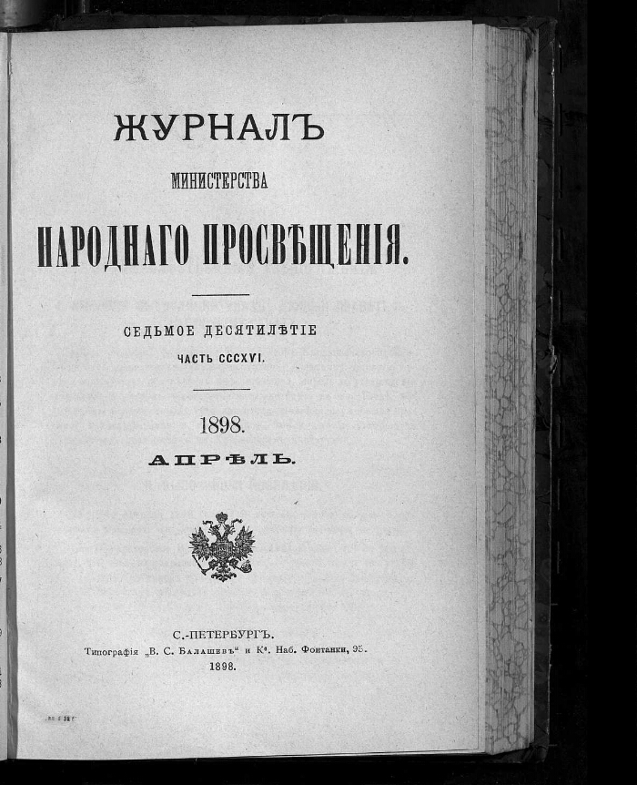 Журнал Министерства народного просвещения. - Санкт-Петербург, 1803-1917. - С Ч. 107 (июль) - 113 (январь) (1860-1862) издание разделилось на 2 части: часть официальную и неофициальную, выходивших в отдельных обложках с параллельной нумерацией частей. С части 113 (февраль) 1862 г. официальная и неофициальная части журнала объединились и выходят в одной обложке. Изменения заглавия: 1803-1819 Периодическое сочинение о успехах народного просвещения ; 1821-1824 Журнал Департамента народного просвещения ; 1825-1829 Записки, издаваемые отделом Департамента народного просвещения ; 1834-1906 Журнал Министерства народного просвещения ; 1906-1917 Журнал Министерства народного просвещения. Новая серия. - В 1830-1833 гг. журнал не издавался. Взамен него вышел сборник "Собрание постановлений по Министерству народного просвещения с 1 января 1829 по 21 марта 1833 года". - Издание прекращено на Ч. 72 1917 г., взамен него выходит журнал "Народное просвещение". - Издание за 1919 см.: Временное сибирское правительство. М-во народного просвещения: журнал ...