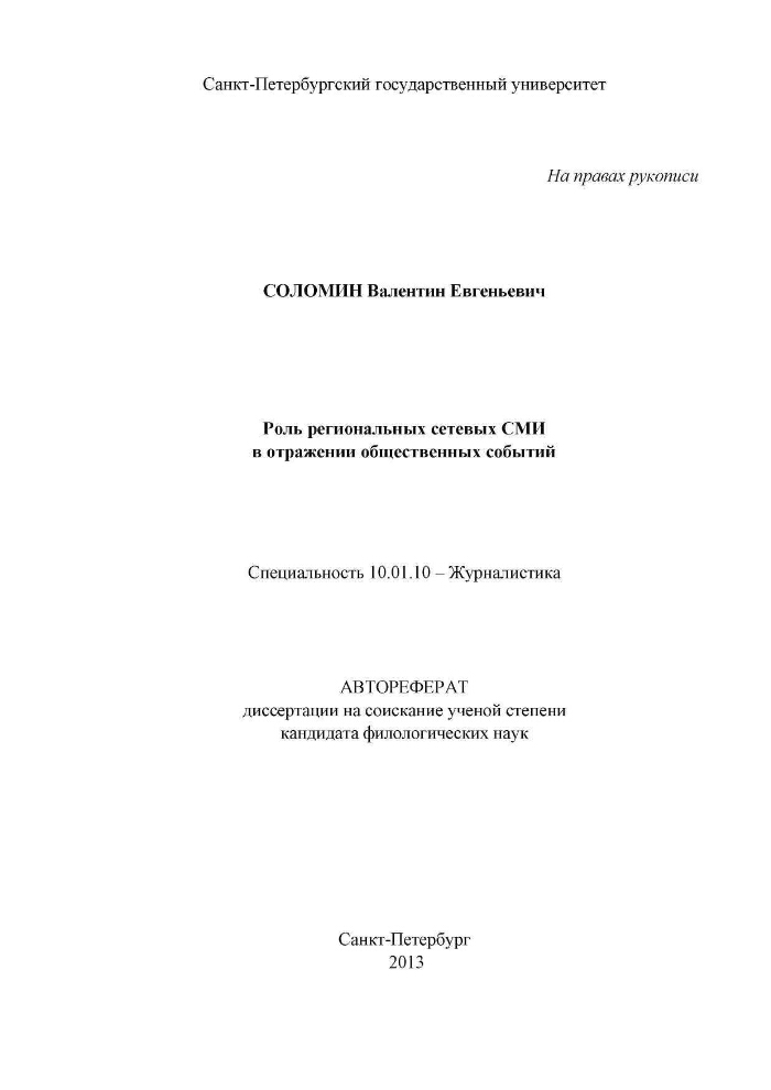 Роль региональных сетевых СМИ в отражении общественных событий : автореферат дис. ... кандидата филологических наук : 10.01.10 / Соломин Валентин Евгеньевич ; [Место защиты: С.-Петерб. гос. ун-т]. - Санкт-Петербург, 2013. -24 с.. -