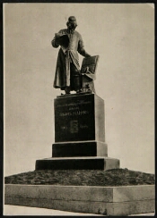 Описание С. М. Волнухин (1859 – 1921). Памятник первопечатнику Ивану Федорову. 1909 г. Бронза, гранит. Москва. - Изогиз, 1960. -открытка 605: Территория. . Источник электронной копии: Галерея Третьякова Издательство Изогиз