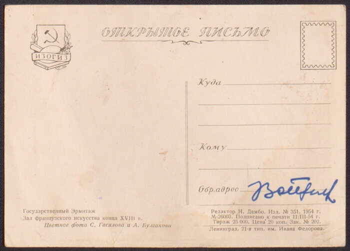 Государственный Эрмитаж. Зал французского искусства конца XVIII в. [Изоматериал : электронный ресурс] : [открытка] / цветное фото С. Гасилова и А. Булгакова. - Электронные данные (2 файла : 3 МБ). -(Санкт-Петербург: Президентская библиотека , 2014). - Режим доступа: интернет-портал Президентской библиотеки. Заглавие с экрана. Электронная репродукция открытого письма: Государственный Эрмитаж. Зал французского искусства конца XVIII в. [Изоматериал] / цветное фото С. Гасилова и А. Булгакова. Ленинград : Изогиз, 1954. 1 открытка : цветной офсет. М-26003. 20 коп. Тираж 25000 экз. Местонахождение: Детский музей открытки, Санкт-Петербург. Копирование пользователями не разрешается.
