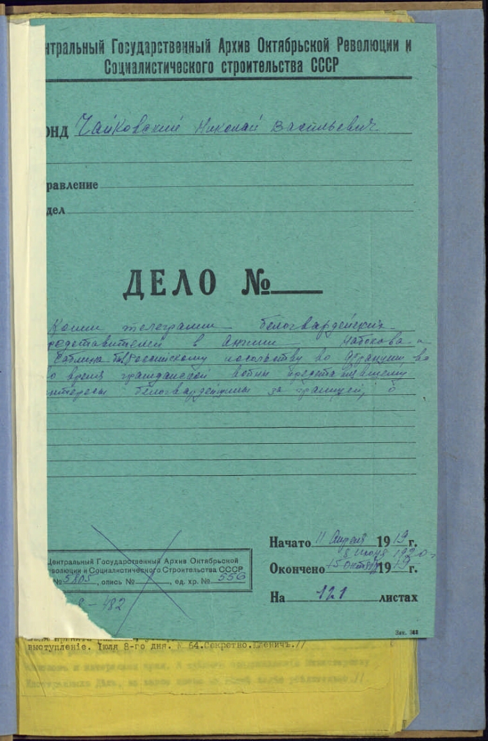 | Фонд | Чайковский Николай Васильевич, участник революционного движения 1870-х гг., создатель общества «Чайковцев», член партии социалистов-революционеров, глава Верховного управления Северной области, глава Временного правительства Северной области, член Южнорус |