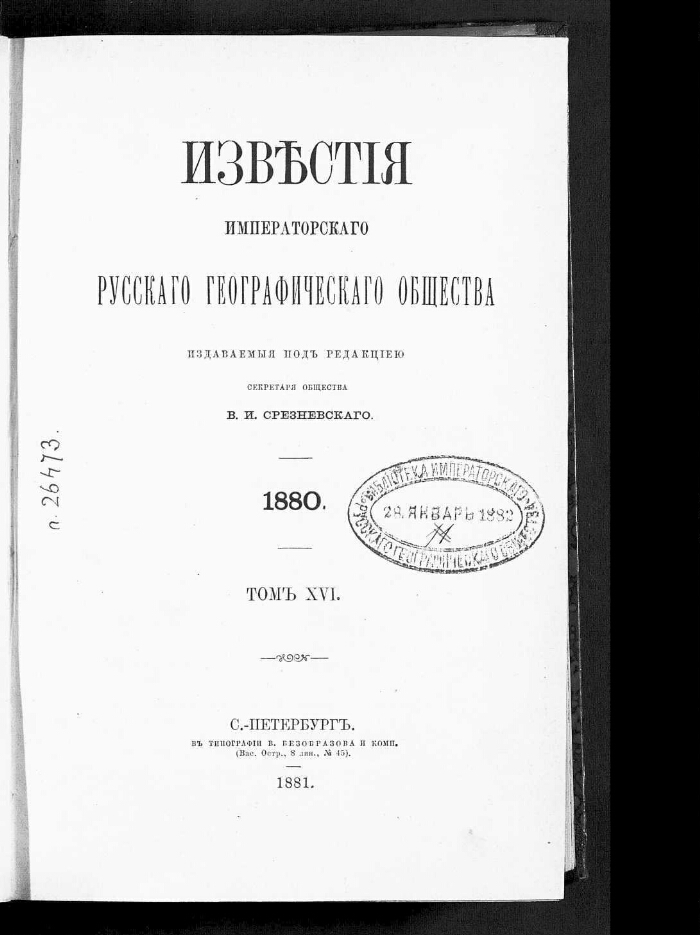 Т. 16 1880, [вып. 1-3 (1880), 4-5 (1881), 6 доп.] / издается под редакцией секретаря Общества В. И. Срезневского. -  В типографии В. Безобразова, 1881. -[613] с. разд. паг. : табл., ил.. - Из содержания: Астрономические определения М. В. Певцова в Монголии и Внутреннему Китаю в 1878-1879 гг. / К. В. Шаригорст (с. 325-377) ; Краткий очерк путешествия по Монголии и Внутреннему Китаю в 1878-1879 гг. / М. В. Певцов (с. 435-457) ; Экспедиция Г. Н. Потанина в Северо-Западную Монголию (с. 61-67) ; Этнографические материалы, добытые экспедициею Г. Н. Потанина (с. 171-180), (и другие материалы). - Библиография в подстрочных примечаниях и в тексте отдельных статей. - Алфавитный указатель к т. 16 "Известий Императорского Русского географического общества" в начале книги.