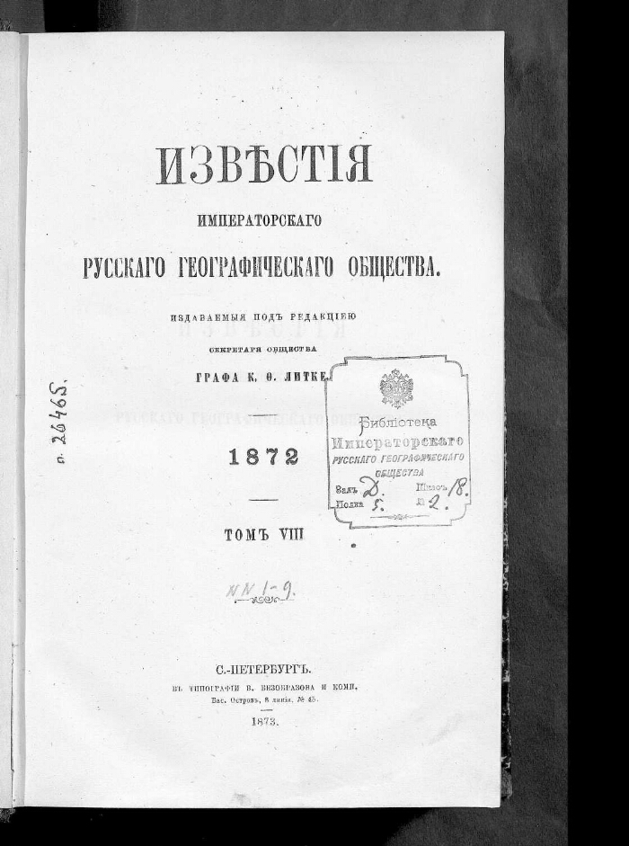 Т. 8 1872, [№ 1-9] / издается под редакцией секретаря Общества графа К. Ф. Литке. - В типографии В. Безобразова, 1873. -[1006] с. разд. паг. : табл., ил.. - Из содержания: Астрономические определения пунктов в Западной Сибири / Мирошниченко (штабс-капитан) (с. 328-330), (и другие материалы). - Библиография в подстрочных примечаниях и в конце отдельных статей. - Алфавитный указатель к 8 тому "Известий Императорского Русского географического общества" в начале издания.