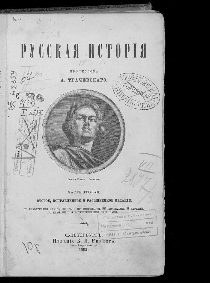 Русская история : с указателями имен, годов и предметов, с 96 рисунками, 6 картами, 6 планами и 3 раскрашенными картинами / профессора А. Трачевского. - 2-е издание, исправленное и расширенное. -Санкт-Петербург : издание К. Л. Риккера, 1895. -2 т. ; 26 см. -