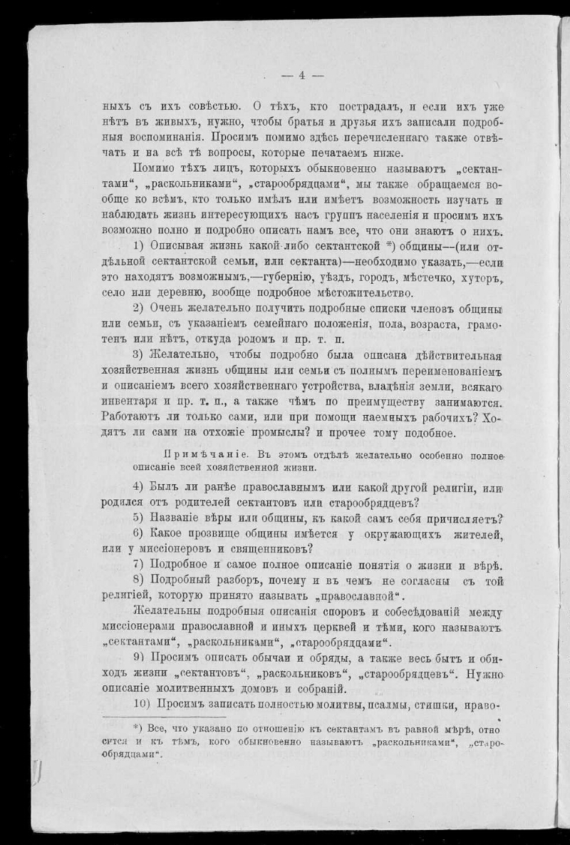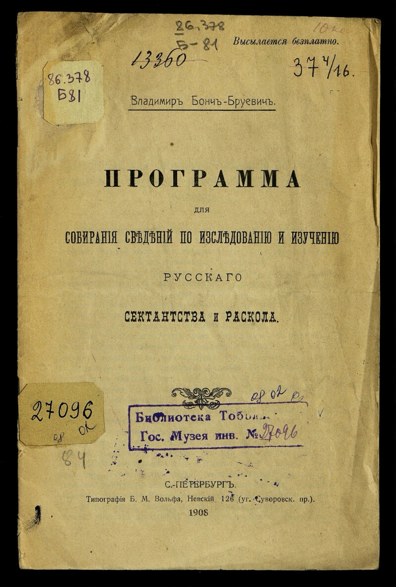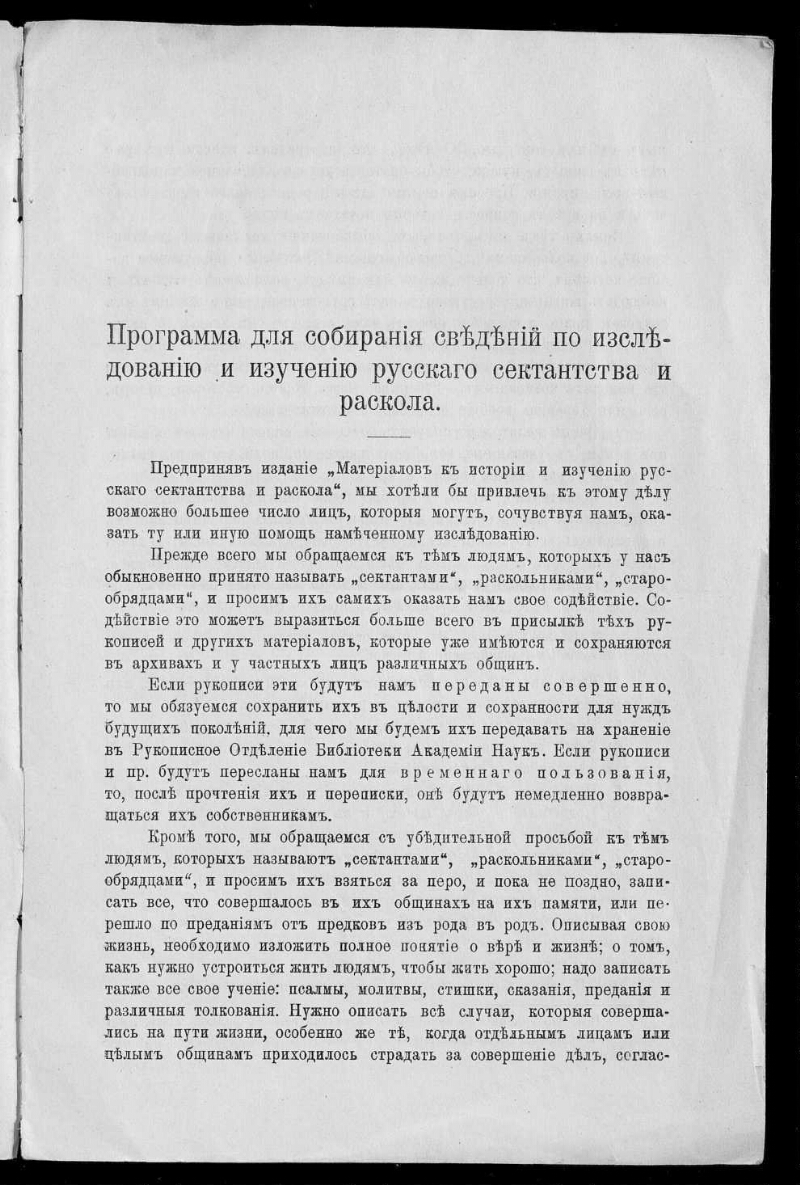 Программа для собирания сведений по исследованию и изучению русского сектантства и раскола / Владимир Бонч-Бруевич. - С.-Петербург : типография Б. М. Вольфа, 1908. -3-12, [2] с. ; 22 см. - Высылается бесплатно. - Экземпляр без титульного листа.