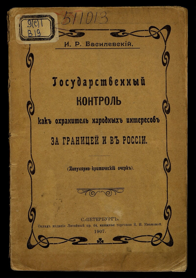 Государственный контроль как охранитель народных интересов за границей и в России : (популярно-критический очерк) / И. Р. Василевский. - С.-Петербург : типография М. Михайловой, 1907. -88 с. ; 22 см. - Библиография в тексте. - Экземпляр с рукописными пометами.