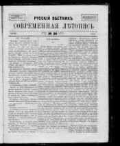 1861. № 26. Июнь: Русский вестник. Современная летопись. - Тип. Каткова и К°, 1861. -32, [4] с.. - Русский вестник выходит ежемесячно; Современная летопись - еженедельно по четвергам. Библиогр. в тексте и подстроч. примеч.. - Экз.: без обл.